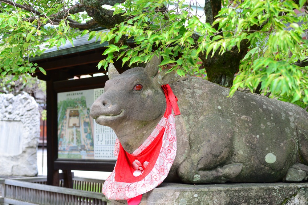 境内いたる所に置かれた「撫(な)で牛」に願いを…