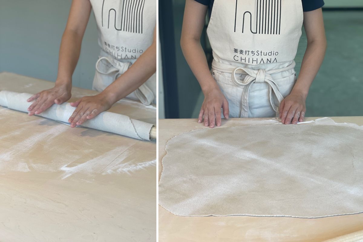 薄く延ばせたら、生地を四角形に整える工程に。麺棒に生地を巻きつけ、1、2、3の合図でリズムよく上から圧をかけさらに延ばしていきます。