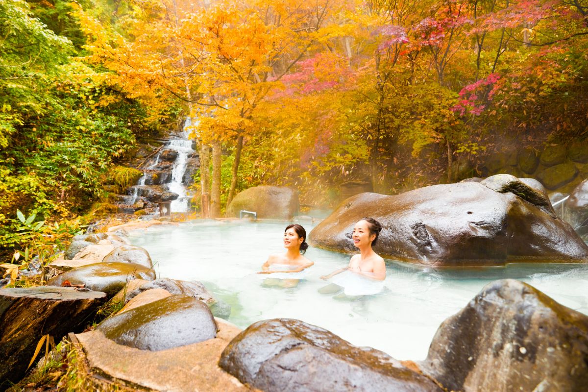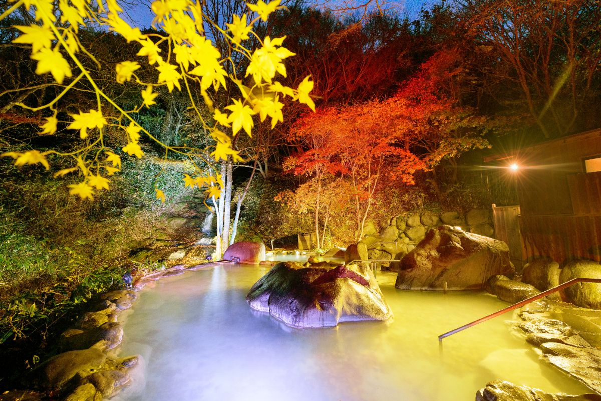 今回ご紹介するイベント「秋の贅沢紅葉露天」では、湯の花が広がるたっぷりの温泉に浸かりながら紅葉を独り占めする、都会では味わえない⾄福のひとときが過ごせます。1組4名まで利用できるのでグループ利用もOK! 露天風呂には湯浴み着も用意されているので、男女気兼ねなく利用できるのもうれしいですね。