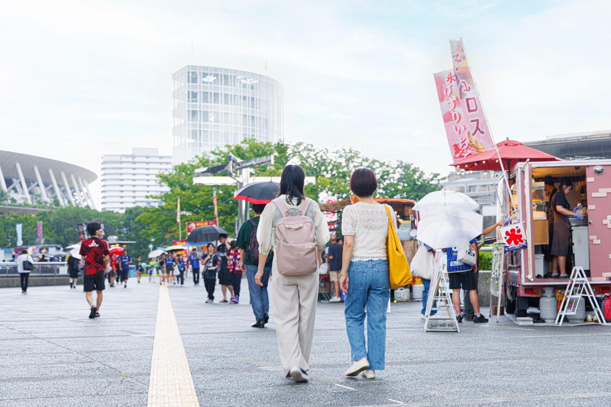 決戦の舞台となる国立競技場は、3路線4駅が利用できる好アクセスのスタジアム。JR新宿駅から2駅の千駄ヶ谷駅からは徒歩5分です。キックオフは18時ですが、グルメもイベントもめいっぱい楽しもうと、15時に到着。すでに青や赤のユニフォーム姿のサッカーファンで賑わっています。