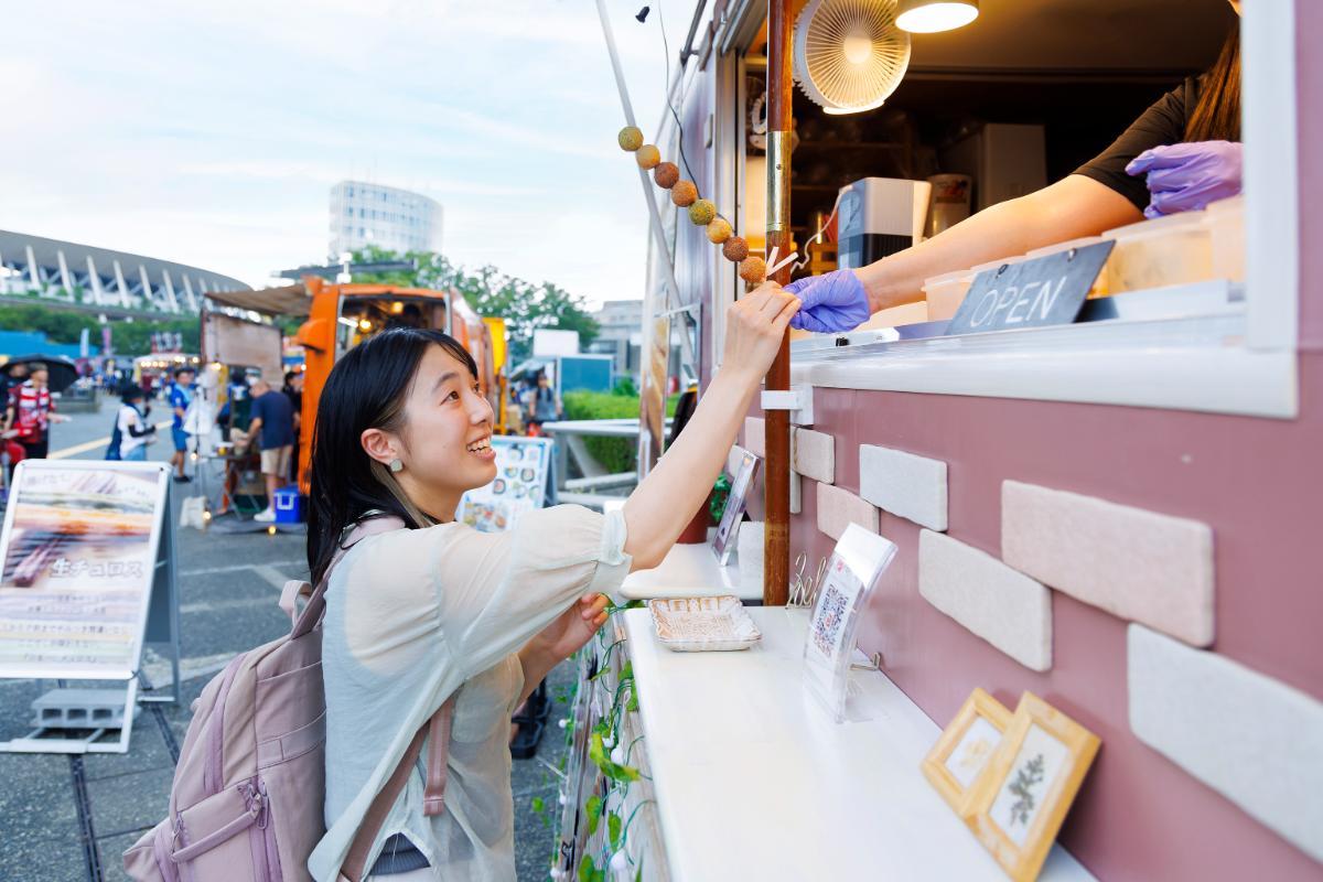 試合当日の14~18時、千駄ヶ谷駅改札口を出てすぐの東京体育館横では、10軒ほどのキッチンカーが並ぶ「ゼルビアグルメパーク」が開催され、スタジアムグルメ(通称スタグル)が販売されていました。ハンバーガーやローストチキン、ビール、チュロス、クリームソーダなど、バラエティ豊かなグルメがいっぱい。ほとんどの店が二次元バーコード決済に対応しているので、利用すると支払いがスムーズです。