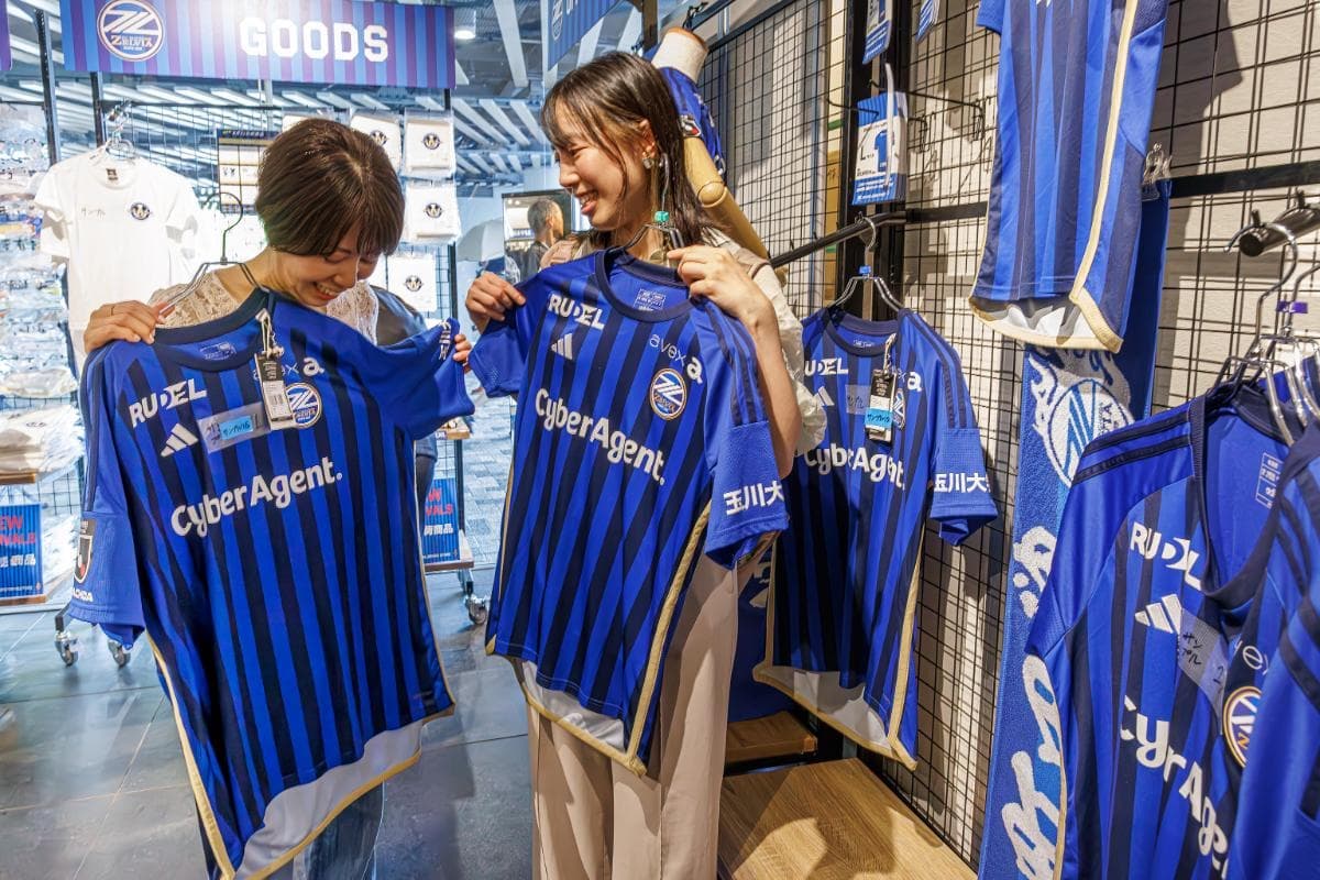 お次は観戦気分を盛り上げるグッズを探しにショップへ。試合を主催するFC町田ゼルビアのグッズが所せましと並んでいます。グッズは毎年デザインが変わるユニフォームから記念グッズ、キャラクターとのコラボ商品まで豊富で、目移りしてしまいます。せっかく応援するからにはユニフォームは欠かせない!とサイズ合わせ。