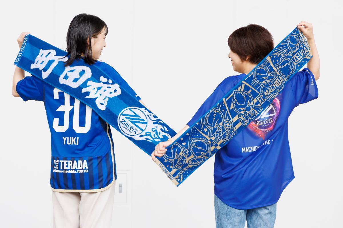 実用的なうえ、回して、掲げて、応援アイテムにも使えるタオルマフラー(各1600円)を購入。写真左は、町田魂&燃える炎のタフでかっこいいデザイン、右はクラブマスコットのゼルビーがゴールドで描かれています。