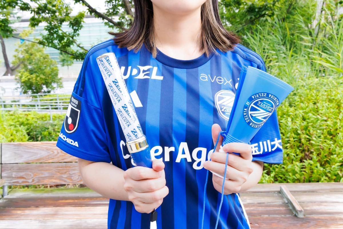 応援グッズもたくさんあります。左の「ゼルビアブルーファンタジーNEXT」2200円はゼルビアブルーの他、カラフルに点灯するペンライト。右の「2パーツメガホン」990円は叩くと気持ちのいい音が響き、声援も送れる優れモノです。
