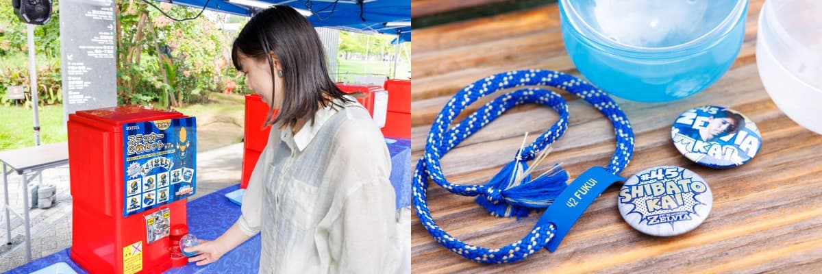 スタジアムの外周では楽しいイベントも開催。オリジナルグッズがゲットできるゼルガチャを発見して、やってみることに。「ミサンガ」500円、「アメコミ風缶バッチ2個セット」300円は、それぞれ36種類あり、どの選手のアイテムが出てくるのかワクワクしながら楽しめます。
