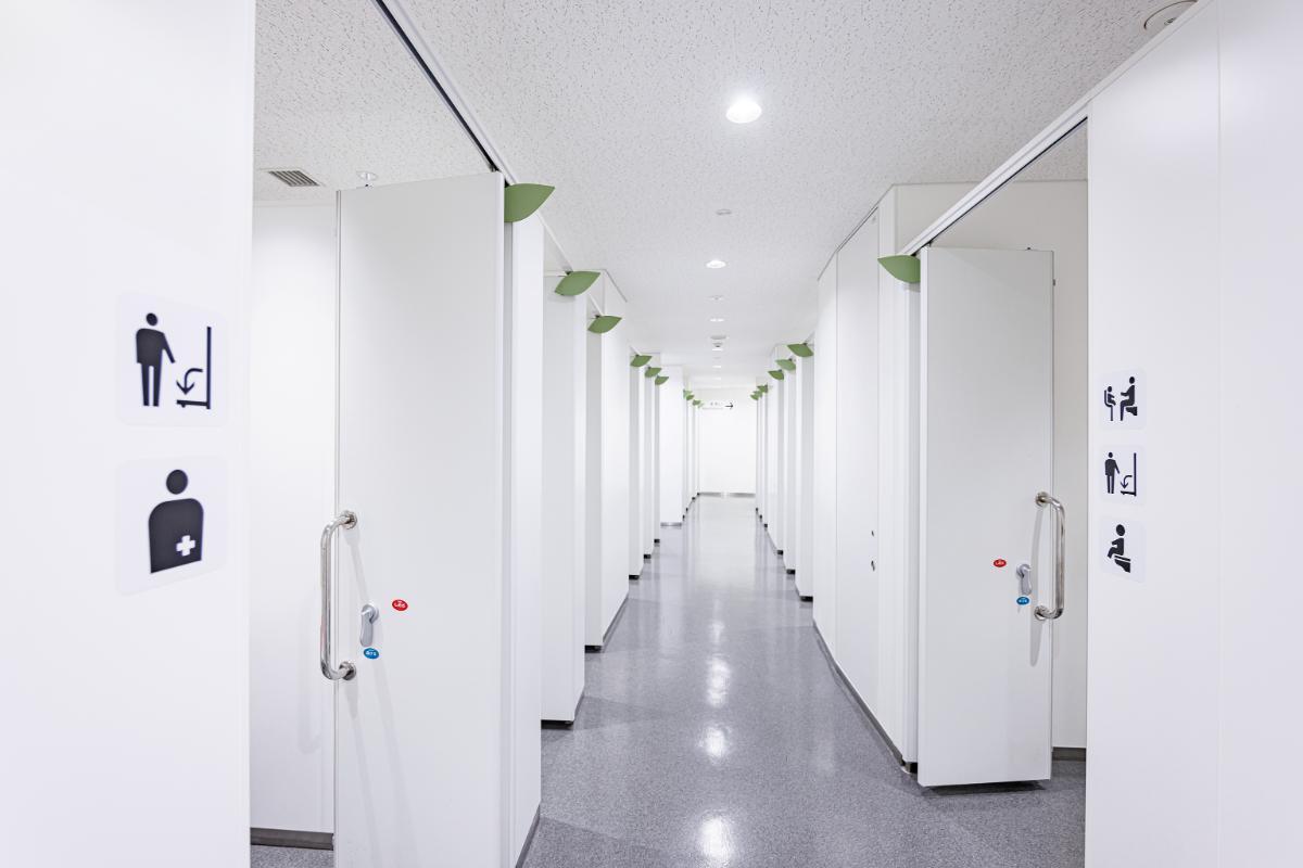 キックオフ前にスタジアム内を探索。トイレは2階2層スタンドだけで男女各6カ所あり、清潔で広々。入口→トイレ個室→手洗い→出口と一方通行の動線で設計され、ドア上部のグリーンの葉っぱは空き個室の目印です。着替えに便利なフィッティングボードやベビーチェア、ベビーベッド、オストメイト対応の多機能トイレも。多くのサポーターが一度に利用するハーフタイムは混み合うので、注意してくださいね。