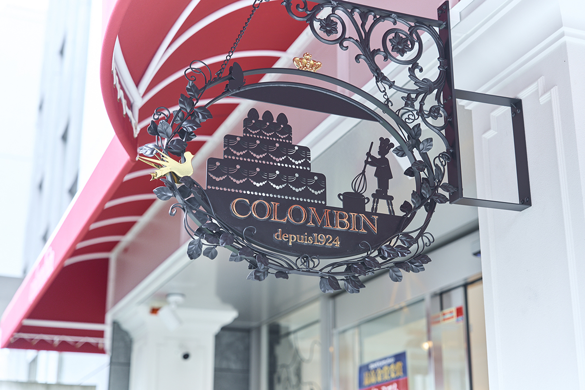 外観には、アイコニックな鉄看板が。こちらは、旧・原宿本店サロンのものをベースとして、初代サロンである銀座コロンバンのアイアン装飾をモチーフにした縁取りをデザインし、現代風にアレンジしたもの。「depuis(フランス語で「~から」の意)1924」とあるように、「コロンバン」の創業は、大正13年(1924)。日本人で初めてパリで本格的なフランス菓子の製法を学んだ門倉國輝(かどくらくにてる)氏により、スタートしました。