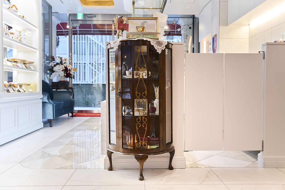 ショーケースの角にあるこちらの棚には、旧・原宿本店サロン時代に使っていた道具などが展示されているので、ぜひ眺めてみてください。