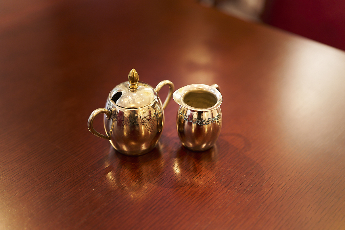 入っていた道具を、特別に見せていただきました。こちらは旧・原宿本店サロンがオープンしたころから使っているという、シュガーポットとミルクピッチャー。57年もの時を経てもきれいな状態で残っており、道具を大切にしてきたスタッフの愛情が見てとれます。