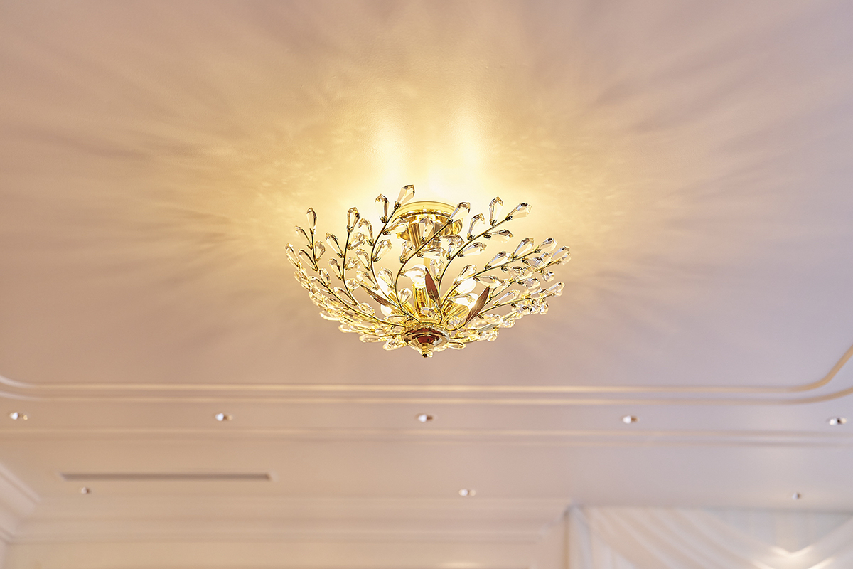 天井にはシャンデリアが配置され、優雅な光を放ちます。ひとりで訪れるからこそ、店内の装飾もじっくり堪能できますよね。こちらは、イタリア製。蔦のようなモチーフとキラキラと輝く葉っぱのデザインは、シンプルでいて洗練された豪華さがあります。
