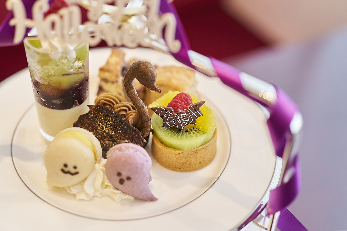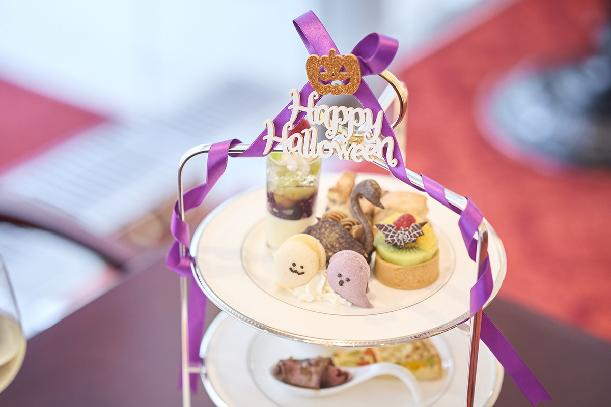 今回いただくのは、2024年10月31日(木)までのハロウィンバージョンのアフタヌーンティー。紫のリボンやハロウィンのモチーフなどの装飾や、ハロウィン仕様のケーキがとてもかわいらしく、眺めるだけで心が躍ります。アフタヌーンティーは約1カ月半ごとに、季節によって内容が変わるそう。次はクリスマス、その次はイチゴフェアを予定しているというから、こちらも楽しみですね。
