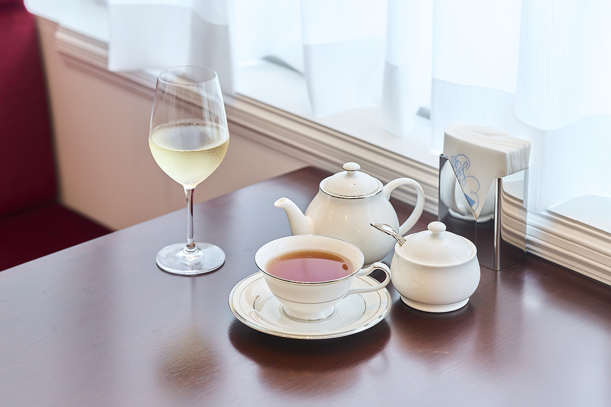 アフタヌーンティーにはドリンク2杯が付いており、コーヒー、紅茶、赤ワイン、白ワイン、ハーブティー、オレンジジュースから選ぶことができます。紅茶は、「ニルギリ」という品種。すっきりとした味わいで、食事のおいしさを引き立ててくれるそうです。今回は、白ワインと紅茶の2杯をオーダーしました。