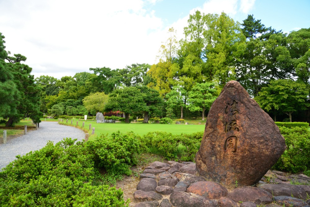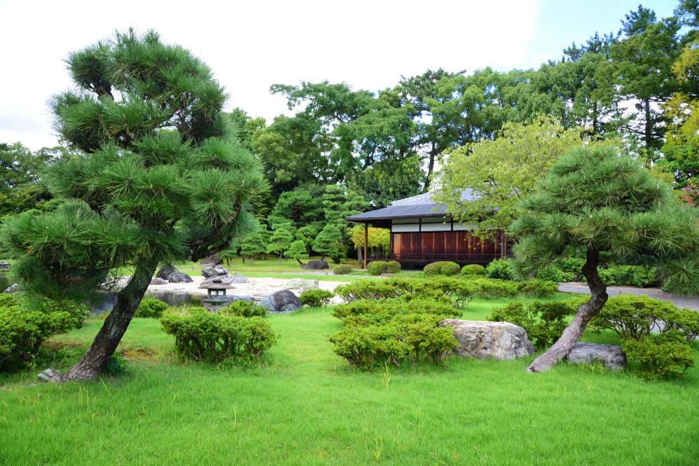 本丸御殿を満喫したら、城の北側にある「清流園」へ。こちらは昭和40年(1965)に造られた庭園で、江戸時代初期の豪商・角倉了以(すみのくらりょうい)の屋敷跡(現:日本銀行京都支店)から建物の一部や庭石、樹木を譲り受け作庭されました。設計には「昭和の小堀遠州」と称えられた中根金作(なかねきんさく)氏らが携わっています。