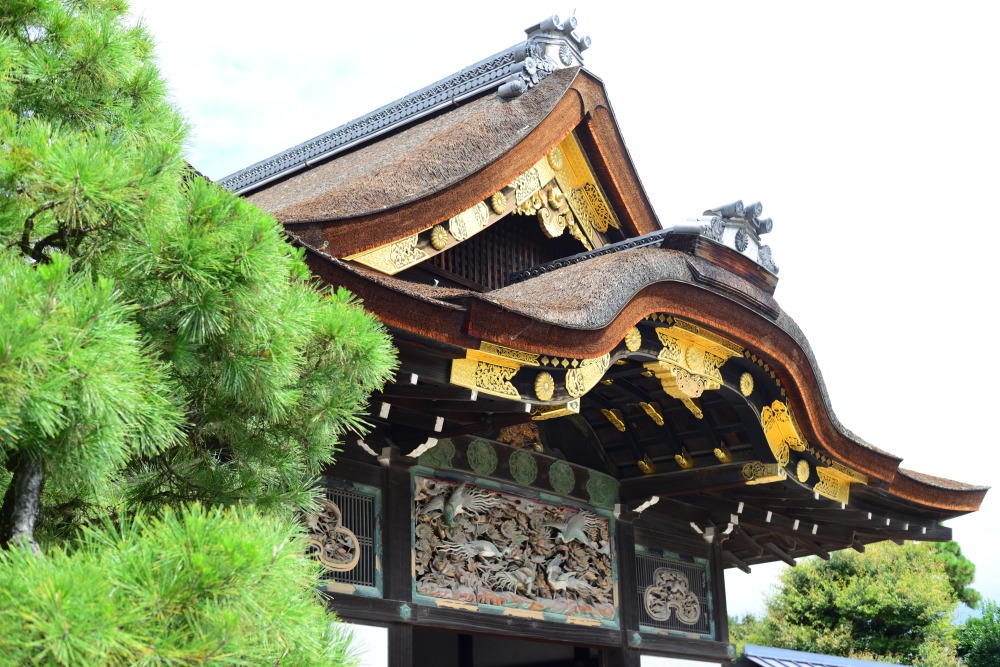 まずは二の丸御殿へと向かいます。こちらは、二の丸御殿の正門・唐門(重要文化財)です。切妻造の檜皮葺の屋根には立派な唐破風が設けられ煌びやかな印象ですね。門の内側には長寿を意味する「松竹梅に鶴」や、聖域を守護する空想上の動物「唐獅子」など、極彩色の彫刻が彩られています。