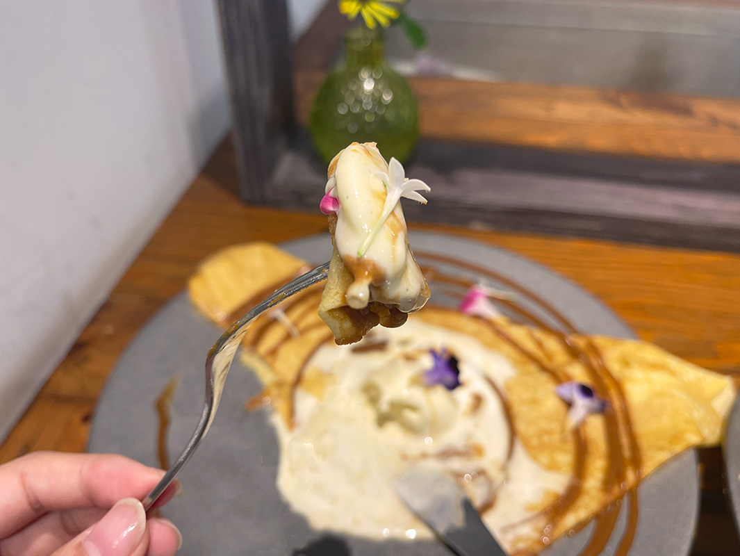 「フラワージェラートクレープ」のトッピングは、自家製ジェラート&エスプレッソキャラメルソース。「ペンタス」や「トレニア」という食用花が散りばめられているので、色鮮やかなビジュアルも楽しめます。
