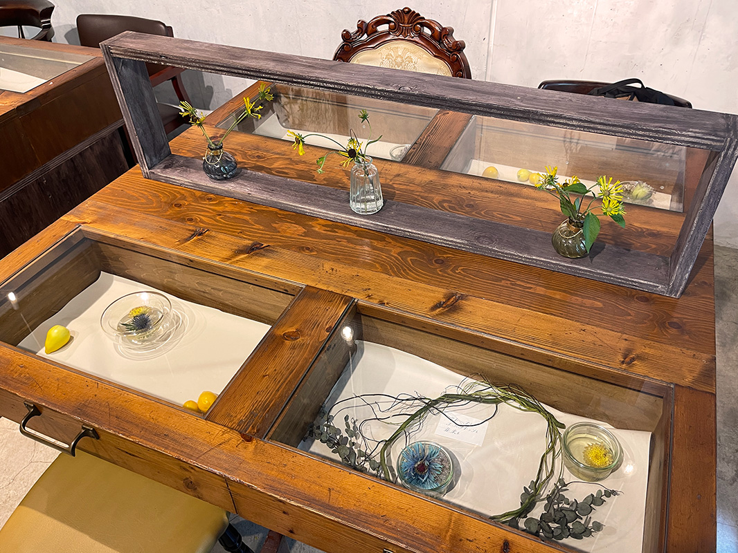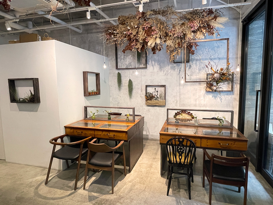 ドライフラワーやレトロな家具を取り入れてアンティークな雰囲気に仕上げた空間は、その場にいるだけで癒やされます。