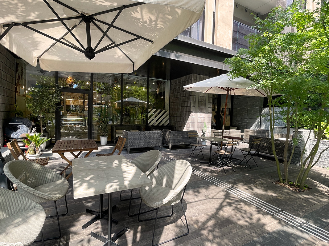 店内の雰囲気から一転、テラス席はグリーン&モダンな家具で都会的な印象に。広々とした空間や木漏れ日、澄んだ空気がクリーンな気持ちにしてくれます。