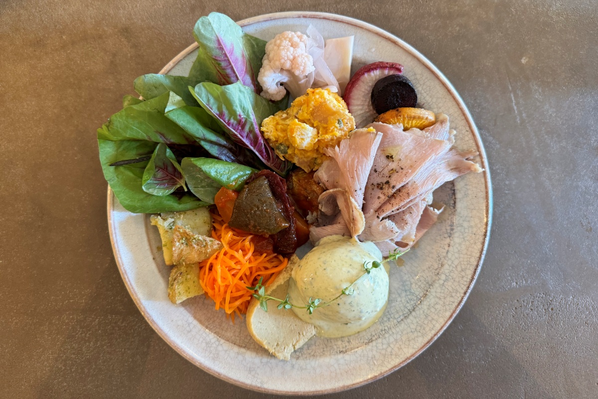 内容はその日の仕入れ状況によって変わり、取材時(2024年9月)は、しっとりとした自家製ハムや、半熟卵にハーブが香る自家製マヨネーズをかけた「ウフマヨ」、フムス、キャロットラペ、カポナータ、バターナッツカボチャのサラダ、旬の野菜のグリルなど。