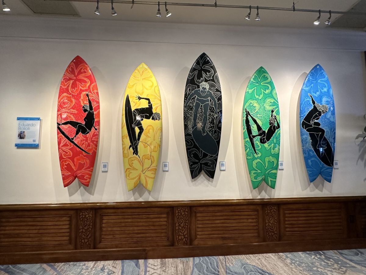 また、世界的に有名なアーティスト、エドゥアルド・ボリオリ氏によるサーフボードアートの展示も。赤、黄色、黒、緑、青色のサーフボードは、デューク氏(黒)を中心に、オリンピックの五輪マークをイメージして描かれています。