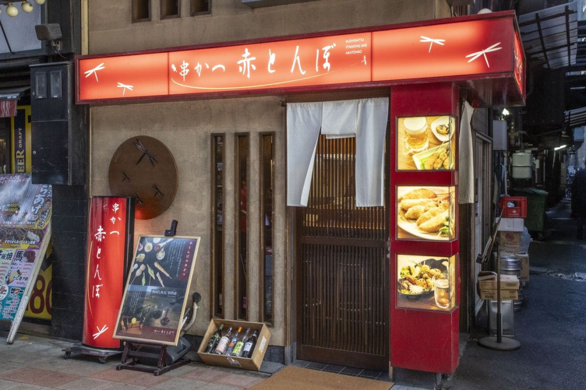阪急・大阪梅田駅、JR大阪駅、OsakaMetro御堂筋線・梅田駅から徒歩5分の「串かつ 赤とんぼ」は、レストランやバー、カラオケ、ゲームセンターなどが立ち並ぶ、大阪・キタ屈指の歓楽街「阪急東通商店街」に位置しています。お店では、牛肉や野菜の定番串カツに加え、新鮮な旬の食材を使った創作串カツをリーズナブルな価格で楽しめます。