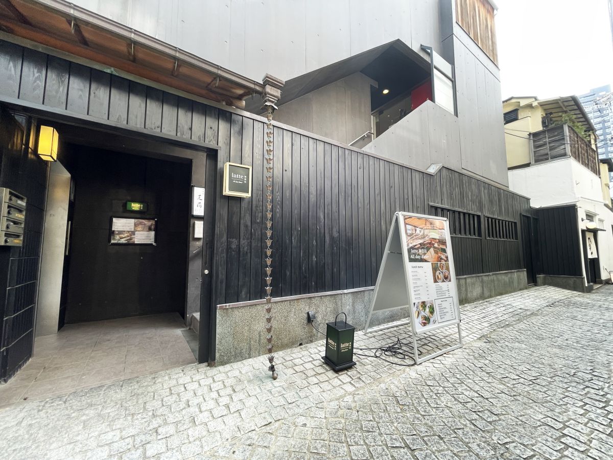 JR飯田橋駅から徒歩約3分、東京メトロ・神楽坂駅からも徒歩約8分の場所にある「latte All day diner」は、繁華街から少し外れた閑静な裏路地にあり、神楽坂らしい石畳の道とよく合うシックなたたずまいをしています。