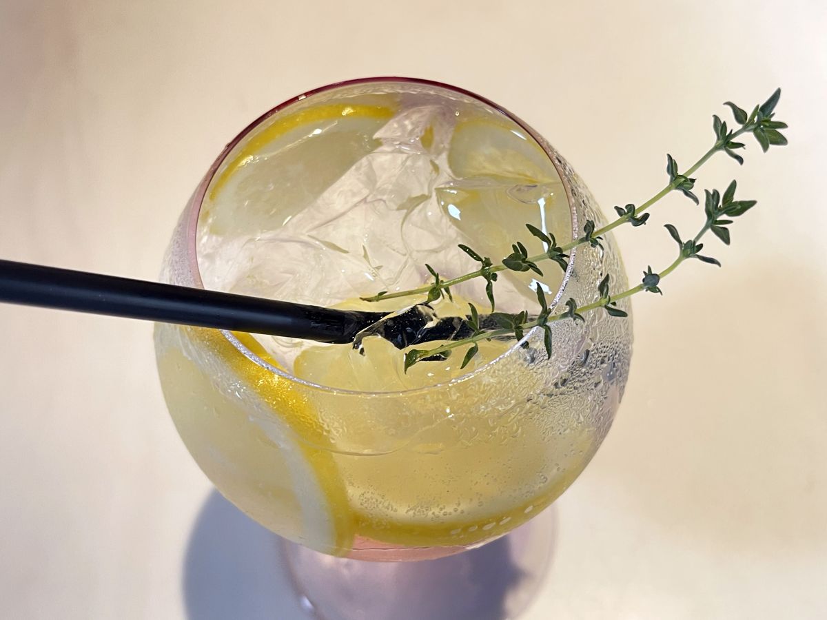 「生搾りレモネードスカッシュ」は、レモンのさわやかさと砂糖のやさしい甘さがマッチした甘ずっぱいモクテル。トップにはハーブのタイムが添えられています。