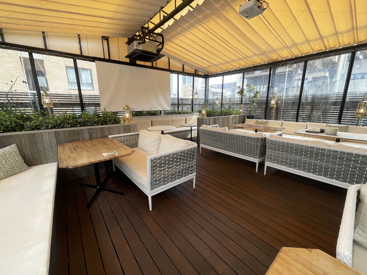 4階のテラス席は屋根付きなので、グランピング気分で食事を楽しめます。貸切で利用することもできるため、パーティーや打ち上げなどにもぴったりです。貸切利用のときは、備え付けのプロジェクターも利用できます。