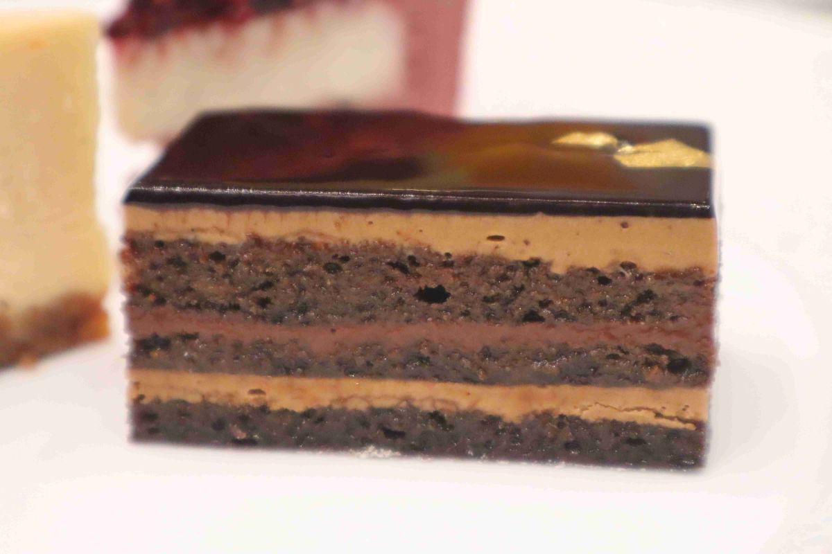 また、生地の間にあるコーヒーシロップをしみ込ませたアーモンドスポンジは、しっとりなめらかな味わいです。ビターチョコレートは苦すぎないので、コーヒーの風味がしっかりと感じられます。