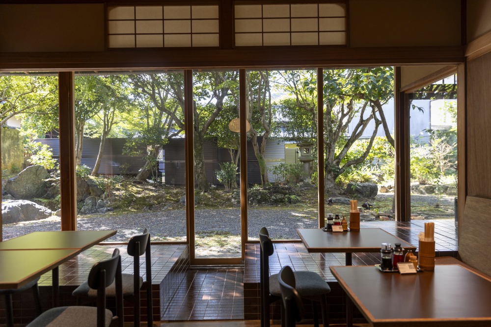 大きな窓の向こうには木々や石灯籠が並び、自然を近くに感じられます。秋には赤く染まる紅葉の景色も見られるのだとか。