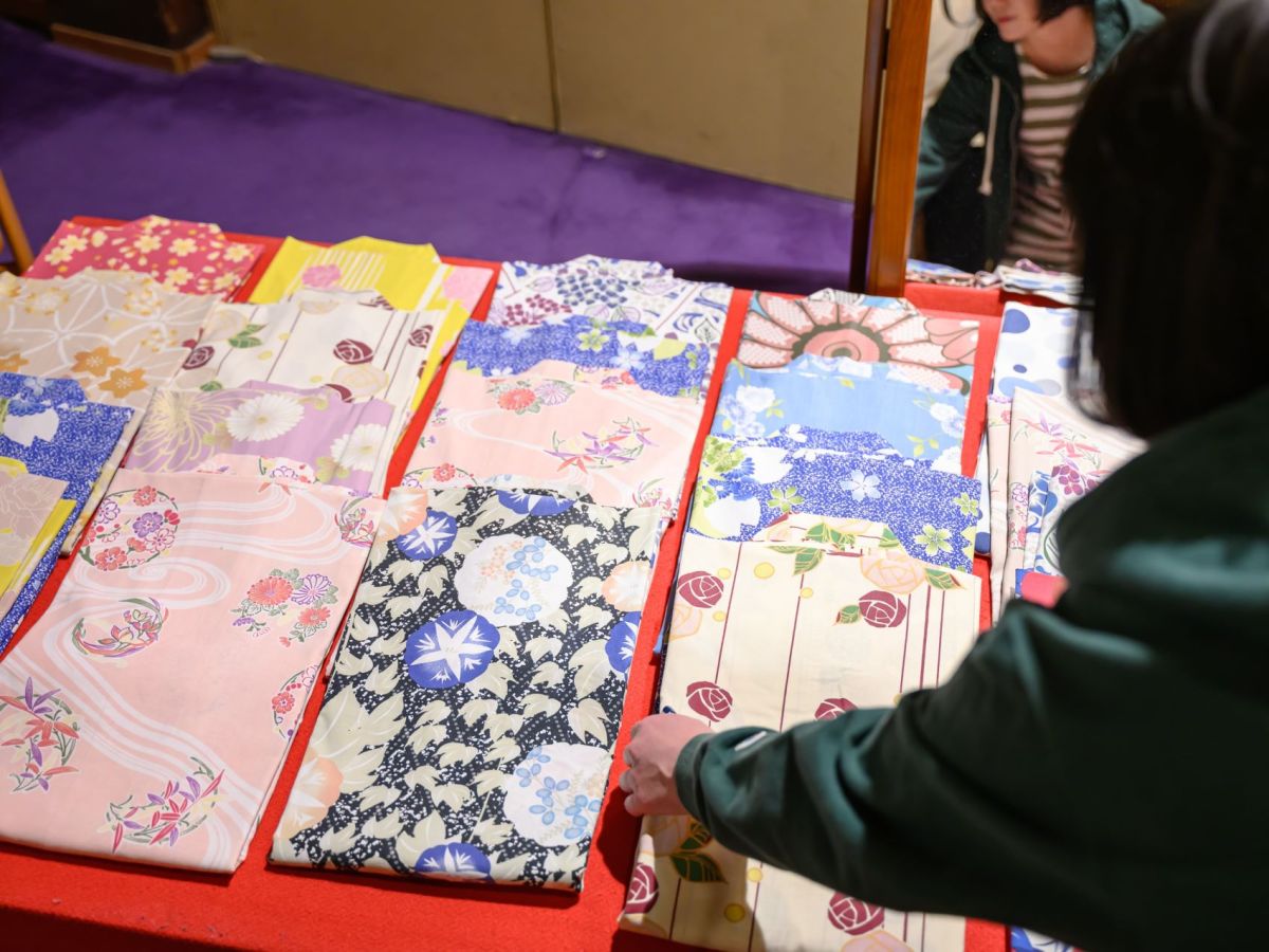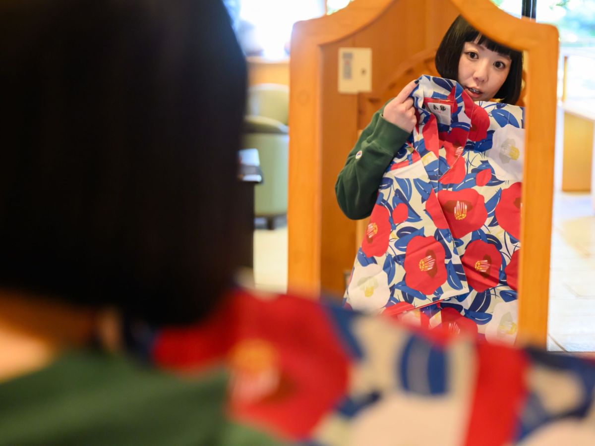 さて、夜は日々の疲れを癒やしに温泉へ。天然ラジウム温泉が特徴の三朝温泉ですが、ここ「三朝館」では大人の女性限定で約30種類から浴衣を選べるという、女子にとってうれしいサービス付き!