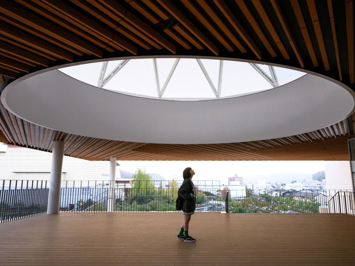 建物全体から木の温かみを肌で感じることのできる心地よい空間です。最上階、3階の展望テラスもかっこいい…!美術品を観にくるのはもちろんのこと、優れた建築技術に惚れ惚れする時間も素晴らしいものです。