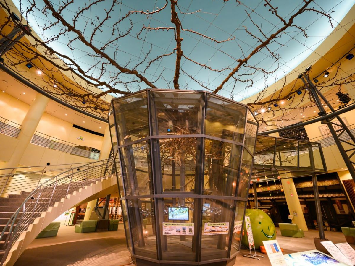 鳥取県立美術館から歩いて10分、「鳥取二十世紀梨記念館 エースパックなしっこ館」に来ました。ここは遊んで知って食べて楽しむことができる”体験型”梨のミュージアムです。 入り口を入るとすぐに見えてきたのは「二十世紀梨の巨木」。ミュージアムのシンボルツリーとしてそびえ立ちます。