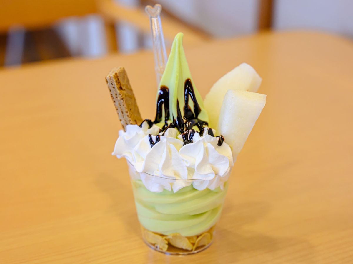 パフェに使用されている梨ソフトがめちゃくちゃおいしい!ソフトクリームとシャーベットのいいとこ取りをしているちょっとシャリシャリした食感がまさに梨!