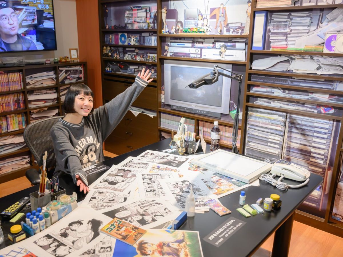 コナン通りを過ぎると、いよいよ「青山剛昌ふるさと館」に到着です。青山先生の思い出の所蔵物や、『名探偵コナン』をはじめとした数々の作品の貴重な資料がズラリと。仕事部屋の再現コーナーでは先生ごっこも可!