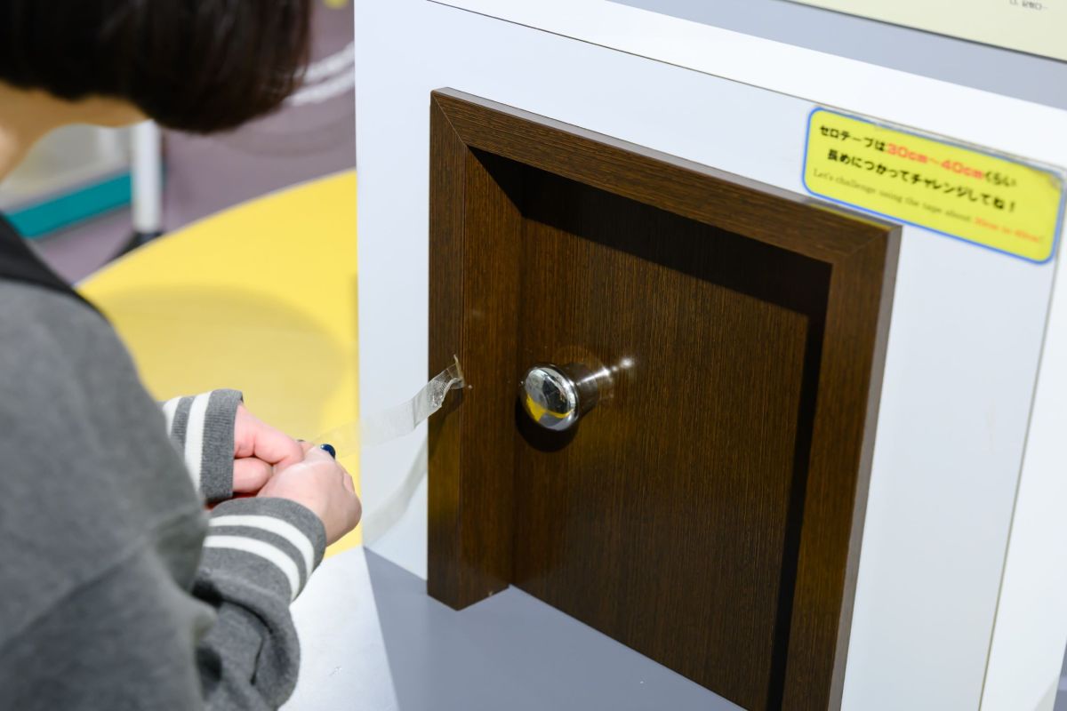 実際に作中に登場するトリックをいくつか体験することも。こちらは、セロテープを使って外からドアロックをかけるトリック。