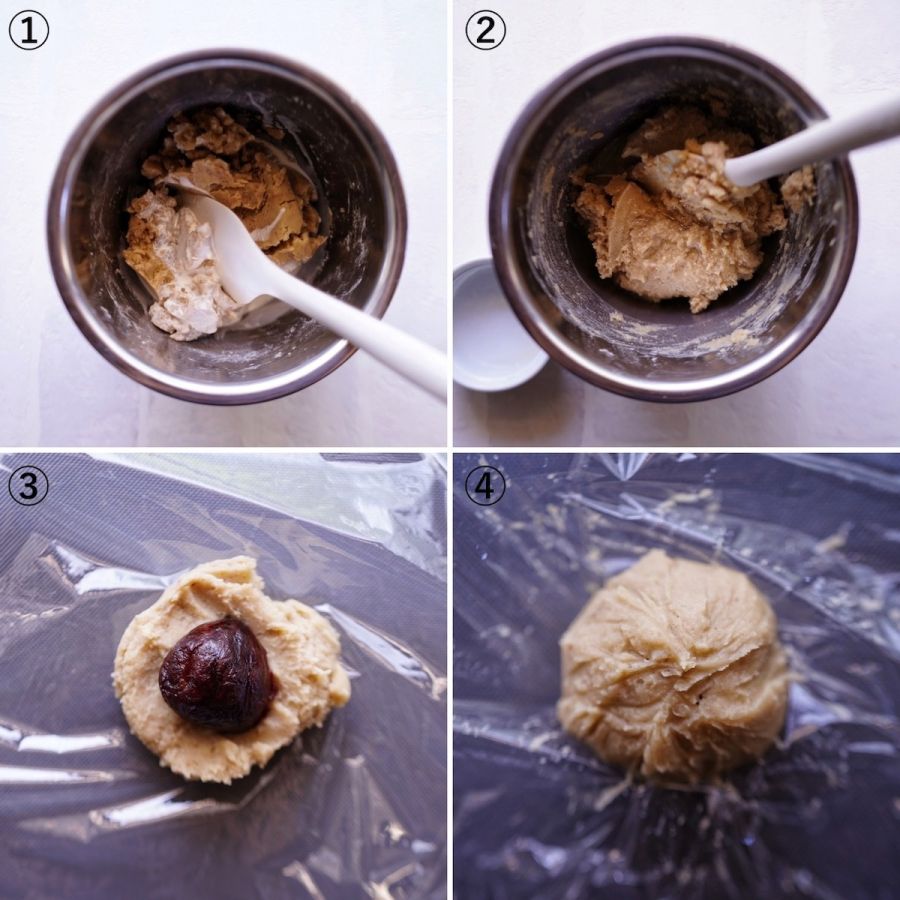 ③ラップの上に、6等分にした②の栗クリームをのせ、栗の渋皮煮(小さければ1個、大きければ半分)をのせます。