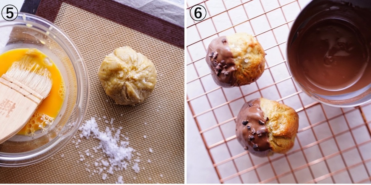 ⑤クッキングシートの上に並べ、溶き卵をハケで塗って、岩塩を適量散らします。