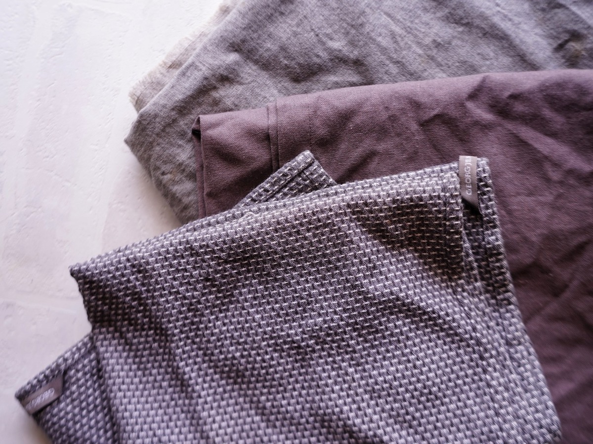 私はグレーやグレイッシュパープル(灰色がかった紫)が好きなので、写真のようなクロス、エプロンなどを使って撮影しています。