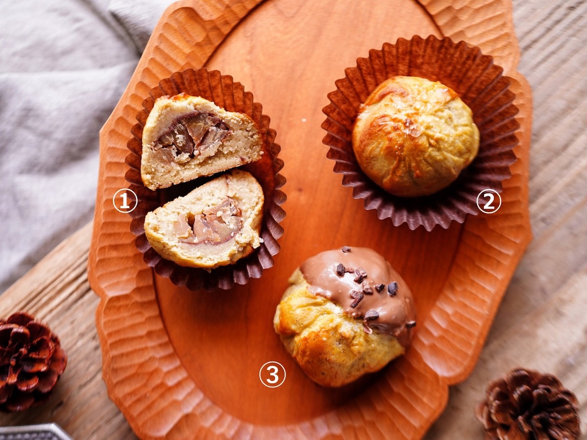 また、①断面を見せたもの、②プレーンの素朴な焼きモンブラン、③チョコがけしたもの、と三者三様の魅せ方を意識しています。