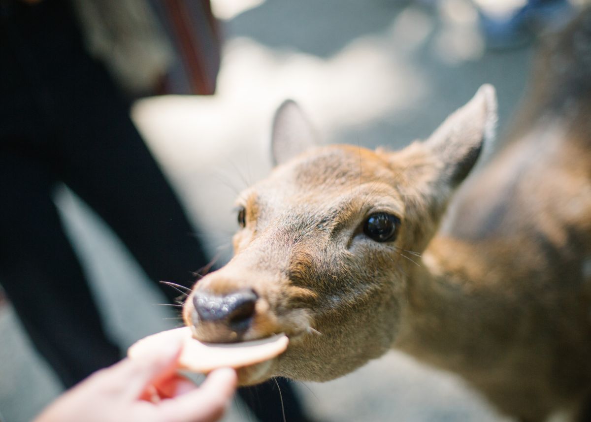 鹿とお近づきになるためのマスト・アイテム「鹿せんべい」は、奈良公園内のあちらこちらで販売しています。鹿は賢いので、購入するとすぐに「あの人!」とピンポイントで近づいてきます。鹿せんべいをねだられたら、すぐにあげてくださいね。特に出産期(5~7月)や発情期(9~11月)は鹿の気が荒くなっているので、じらすと体当たりしてくることもありキケンです。そして、鹿せんべい以外の食べ物は絶対にあげないことが、鹿と人とのお約束。