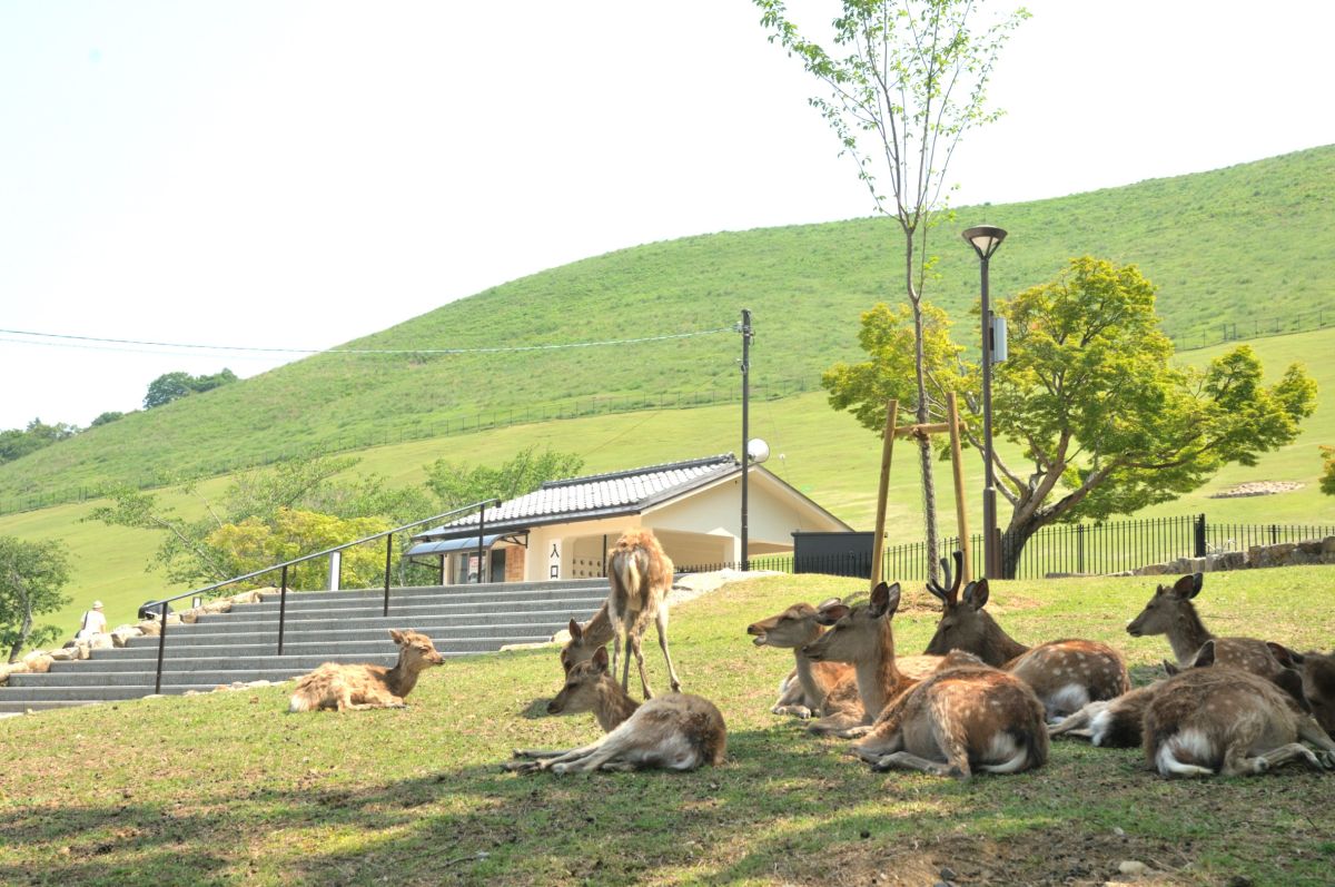 2つ目は広大な芝生広場が広がる「春日野園地」。木陰にベンチも設置されていて、「東大寺大仏殿」や鹿たちを眺めながら、のんびりと寛ぐことができます。
