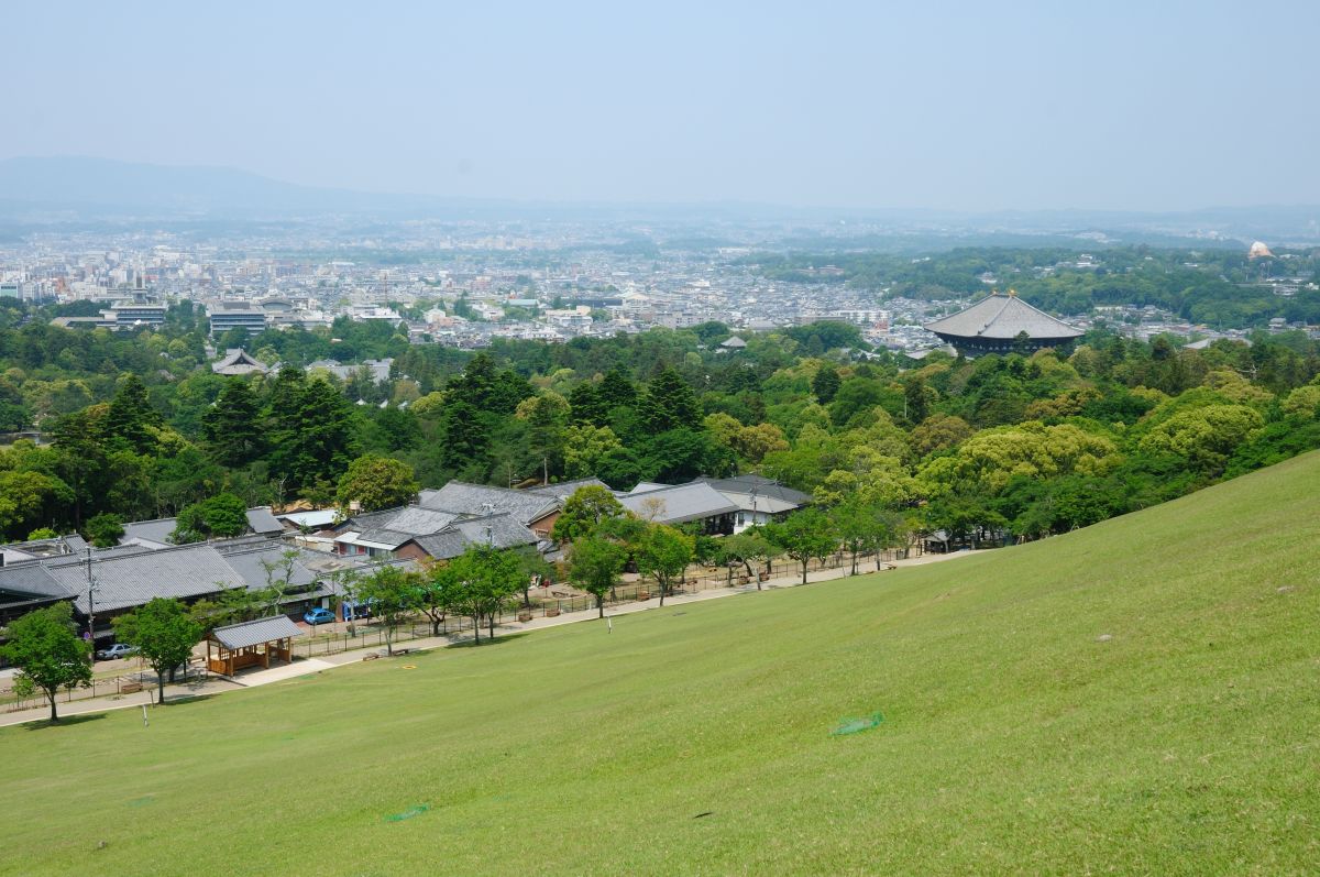 入山ゲートを入ってほんの少し登っただけで、「奈良公園」を見渡す素晴らしい景色に出会えます。右に見える大きな建物は、「東大寺大仏殿」。若草山は笠を3つ重ねたような三重の地形で、入山ゲートから見えるのは一重目です。