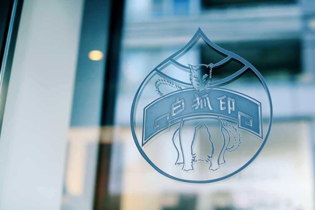 トレードマークのロゴは、大正時代に6代目が考案したもの。看板を咥えた白狐がユニークです!店頭のガラス扉でもお出迎えしてくれるほか、「胡粉ネイル」のパッケージや、日本画用の絵の具などのパッケージにも使用されています。