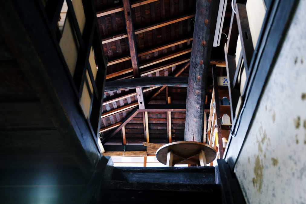 お店の奥には職人さんの工房や倉庫があり、見学もできます。何代も受け継いできた建物は、大きな梁がその歴史を物語っていますね。