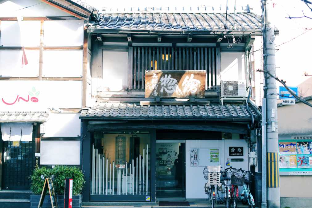 漆喰壁に格子窓の京都らしい町家の建物と、どっしりとした看板が目印です。
