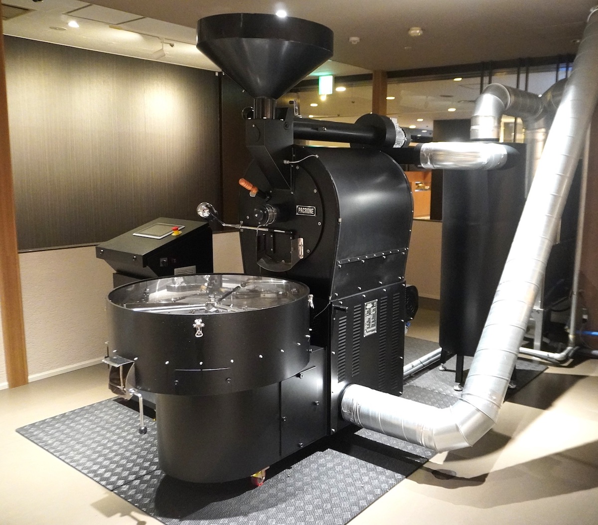 こちらが、お店自慢の大型焙煎機。「一度に焙煎できる豆の量は約20㎏。間近でご覧いただいて、驚かれるお客様も多いですね」と説明してくれたのは、店長の松永風香さん。今話題の「ロースタリーカフェ」は、世界各国の観光客でにぎわう京都の玄関口にオープンしました。