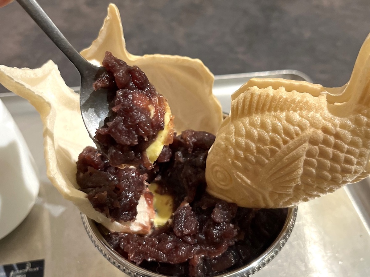 コーヒーと一緒にいただくスイーツを、どれにしようか迷うのもシアワセなひととき。北海道産小豆を使用した粒餡がたっぷりの「あんバターもなか」は、昭和3年(1928)に福岡で創業した「もなか屋たねよし」の鯛もなかを使用。ビジュアル的インパクトも抜群です。