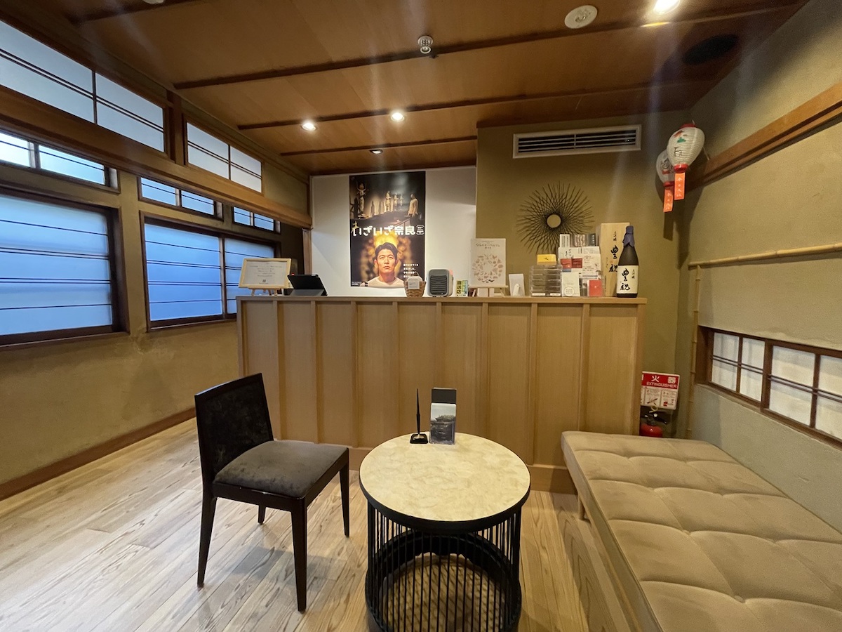 まずは正面入り口を入って、すぐ横のフロントでチェックイン。旅の目的や、どういう奈良の楽しみ方をしたいかなどを、チェックインのときにスタッフさんが丁寧に聞いてくれるのもうれしいところ。歴史が好き、古民家建築が好き、日本酒が好き、かき氷が食べたい、カフェ巡りをしたい、などなど奈良の楽しみ方はたくさん。詳しく話をするなかで、興味のあるおすすめスポットも紹介してもらえます。
