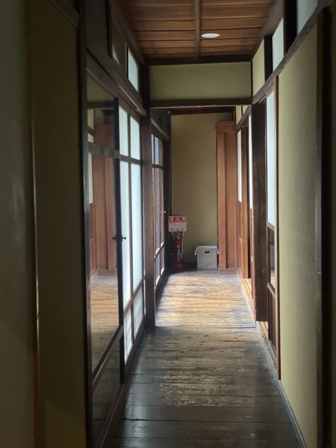 昔ながらの味がある縁側廊下は、お寺などでよく見られる「うぐいす張り」。歩くと「きゅっきゅっ」と音が鳴ります。庭に面した窓ガラスは、よく見ると微妙な歪みがあって、ガラス越しの景色が少しゆらめいて見えるレトロな大正ガラス。建物が重ねてきた時間に、ふと想いを馳せました。