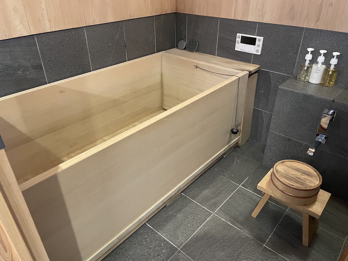 お風呂は職人さん手づくりの檜風呂。木の香りに包まれて、リフレッシュできそうです。